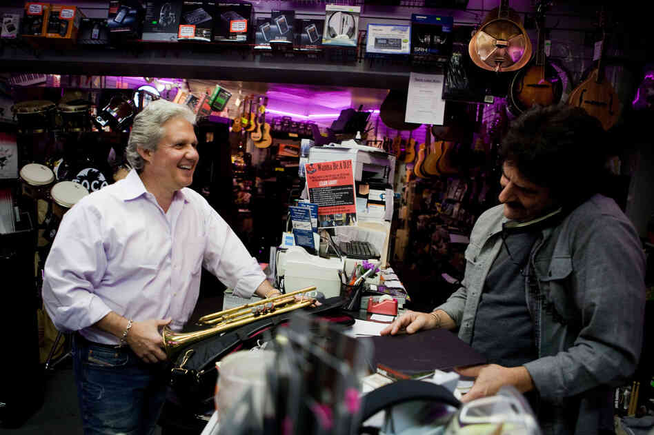 Michael Pagliaro, left, laughs with Paul Scattaretico at the Muzic Store Inc. in Dobbs Ferry, N.Y., as Pagliaro picks up instruments for his rental business. Before Pagliaro had a hip replacement, pain made it difficult to work.